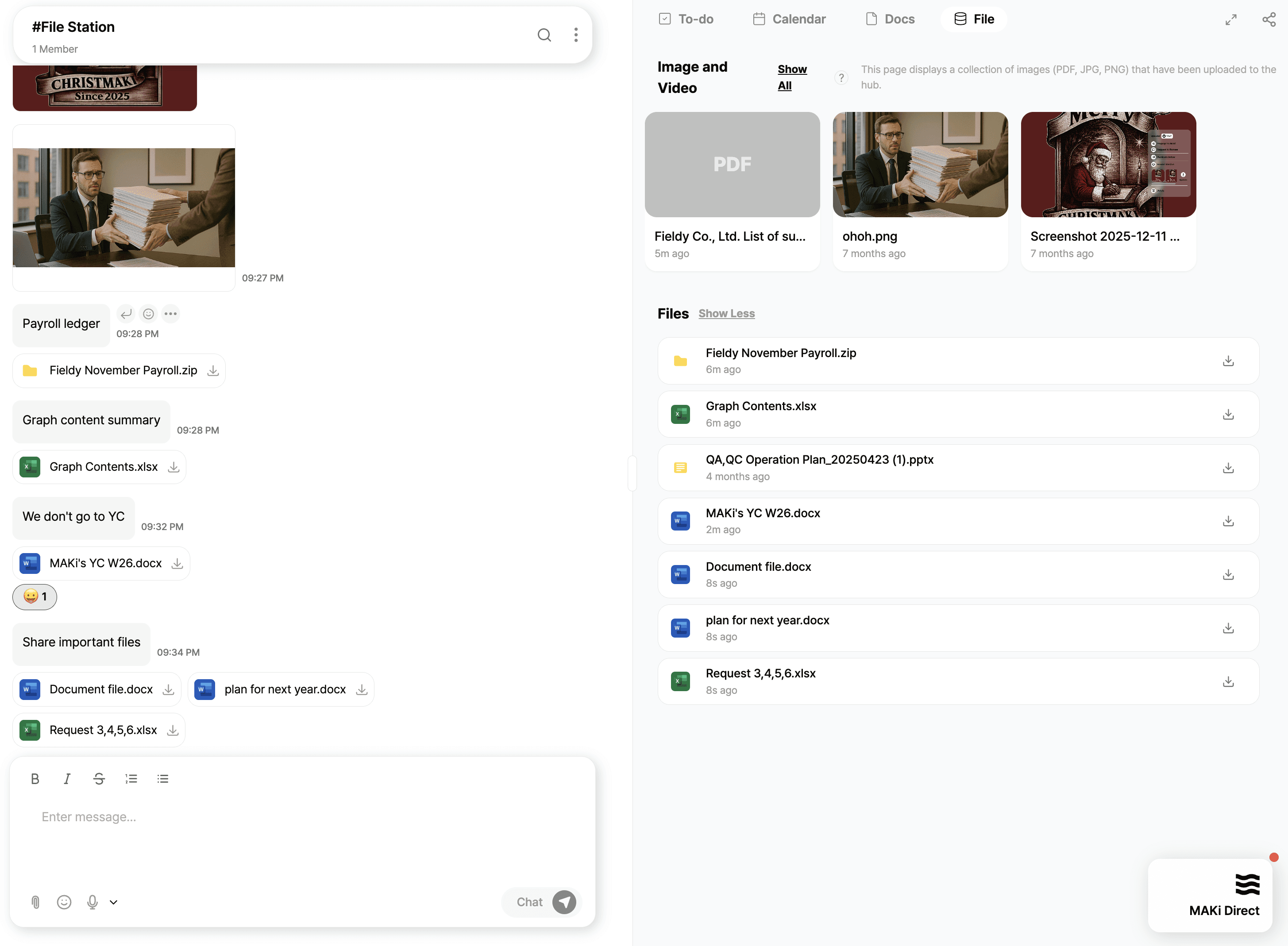 Below the visual gallery, MAKi lists every file uploaded in chat, including: