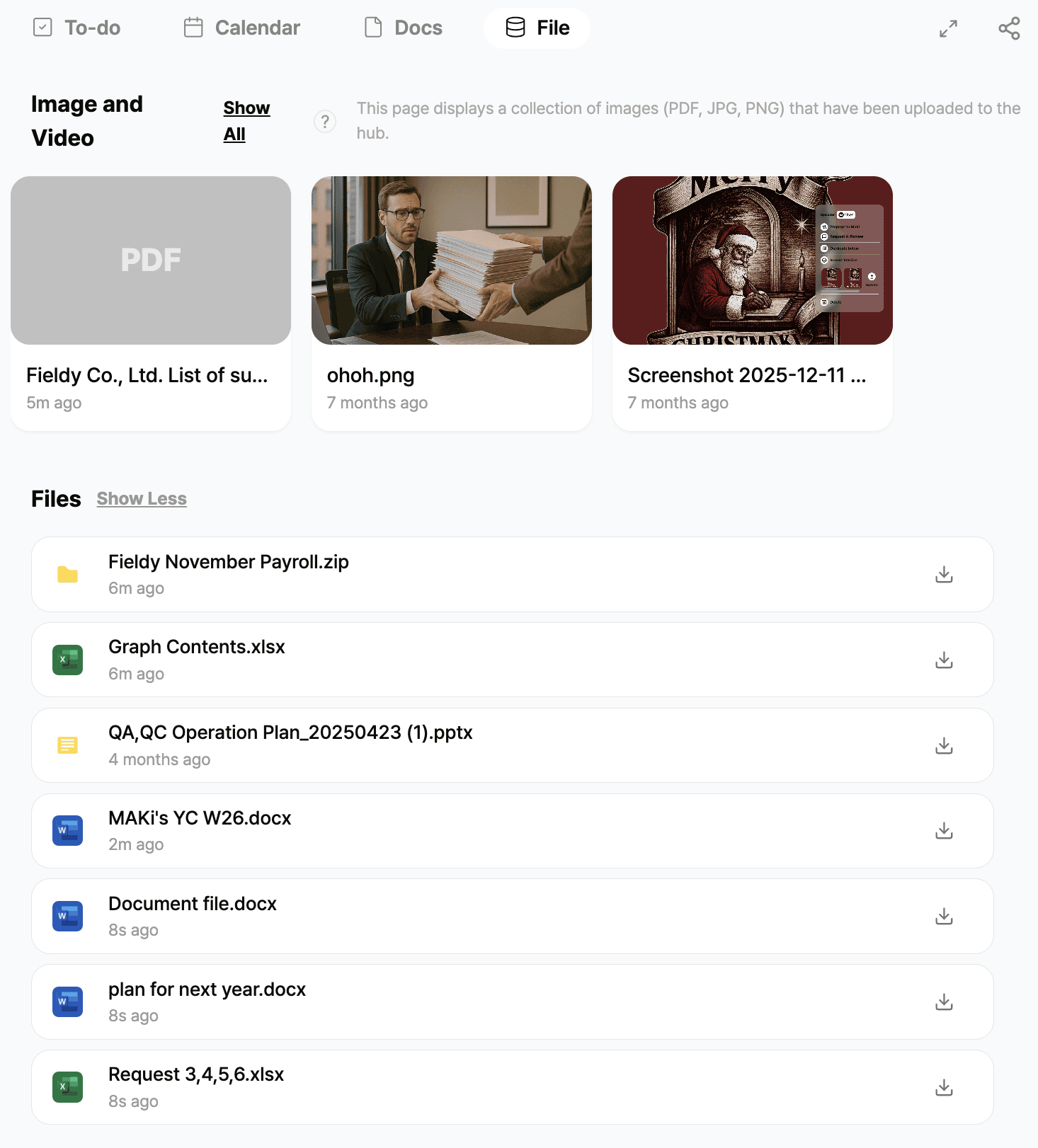 The File Library collects every file shared inside the Hub images, videos, documents, spreadsheets, PDFs, and ZIP files.